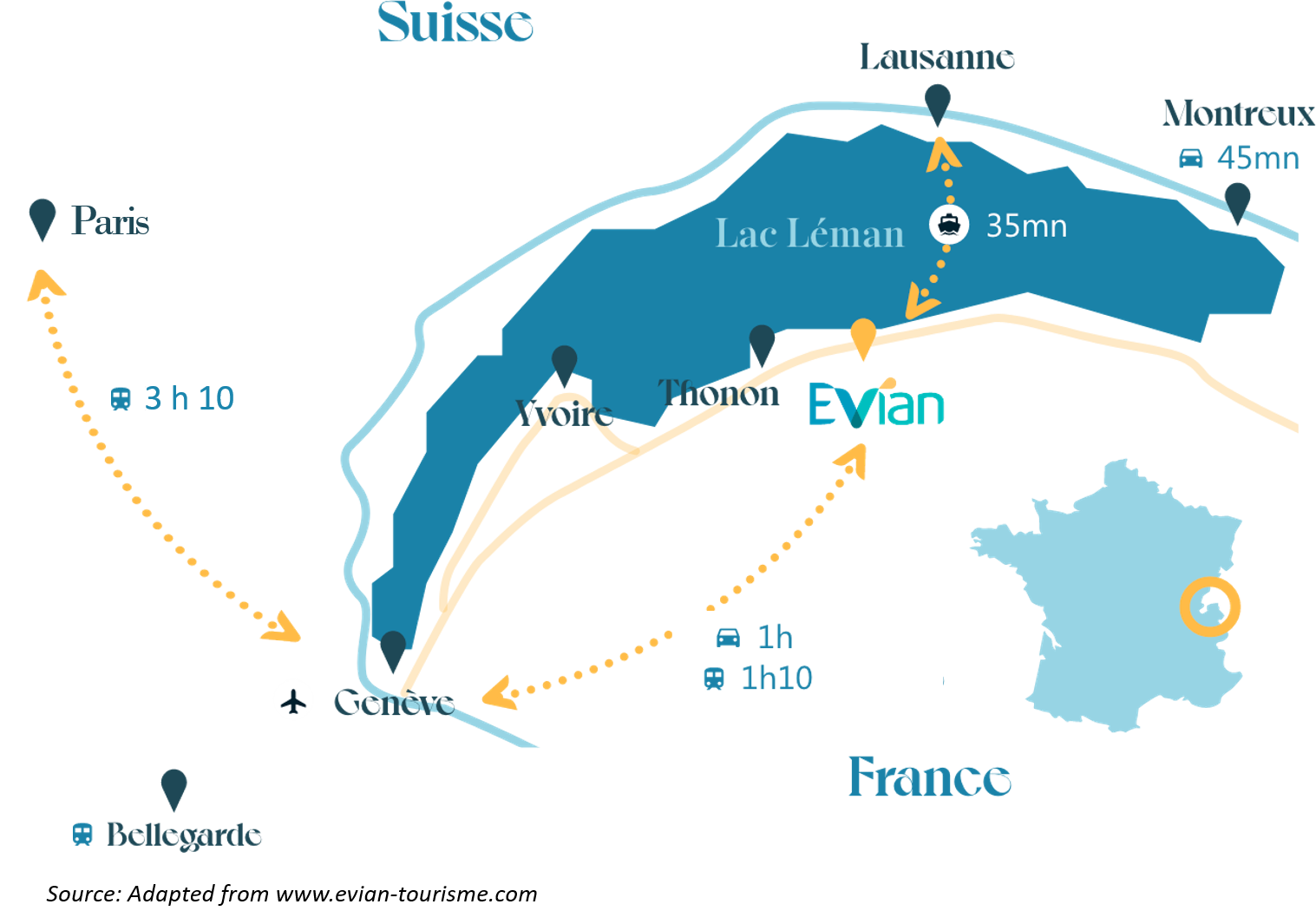 The journey from Geneva Airport (GVA) to Evian takes approximately one hour by train with Swiss Railways. Please check the timetable at the following address: https://www.sbb.ch/en. Select the route from ‘Geneva Airport’ to ‘Evian-les-Bains’.